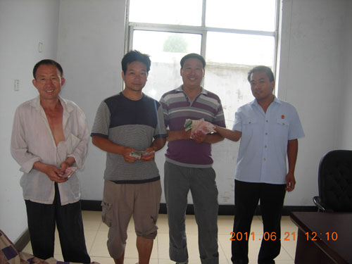 我院十分重视农民工讨薪案件的审理,6月21日中午,被告王涛、王立站将四个案件的涉案农民工工资送到了万古法庭,万古法庭法官马上通知四个农民工到法庭领钱。图为农民工江光辉、曹志相等人从法官李国勇手中接到自己12000元的工资,满意的笑了。