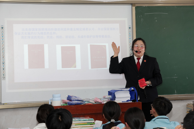 民事审判一庭法官助理陈艺丹走进老店镇青庄中心小学,为同学们送上了一堂生动的法治课。课堂上,陈艺丹结合真实案例,围绕校园欺凌、网络安全、自我保护等内容,用通俗易懂的语言讲解法律知识,引导学生知法、懂法、守法、用法。现场还发放了普法宣传手册,通过互动问答,让法治理念深植学生心中,进一步增强了学生的法治意识和自我保护能力,为建设平安校园、和谐校园奠定了坚实基础。