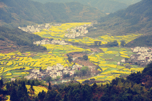 江岭地处婺源县最东北,是婺源最值得去的地方。那里漫山遍野的油菜花呈梯田状,从山顶铺散到山谷下。站在山顶望去,脚下大片的山谷内,油菜花层层叠叠,一望无际,中间围拢着几个小小的村落,黑瓦白墙的徽派民居夹杂其间,构成了一副极美的婺源农村风光画卷。